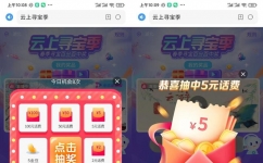 【活动内容】:参加中国电信举办的云上寻宝季春季寻宝抽话费活动,用户参与活动,完成相应任务,即可获得抽奖机会,活动期间用户完成以下任务最多可获得9次抽奖机会;另外每天登录页面可额外增加1次抽奖机会,有机会抽到0.1-100元手机话费、或者金豆,中到的话费不秒到。