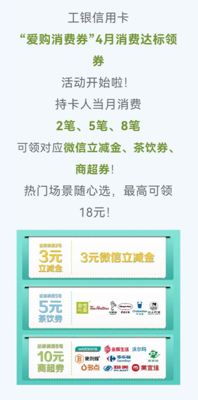 持卡人使用工银信用卡当月单笔达标消费笔数2笔,有机会领取一张满10元立减3元通用微信立减金;当月单笔达标消费笔数累计消费5笔,有机会领取一张茶饮类满20元立减5元场景消费券;当月单笔达标消费笔数累计消费8笔,有机会领取一张商超类满30元立减10元场景消费券。