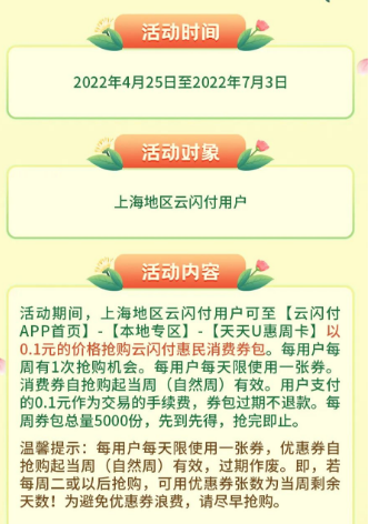 活动期间,上海地区云闪付用户可至【云闪付APP首页】-【本地专区】-【天天U惠周卡】以0.1元的价格抢购云闪付惠民消费券包。每用户每周有1次抢购机会。每用户每天限使用一张券。消费券自抢购起当周(自然周)有效。用户支付的0.1元作为交易的手续费,券包过期不退款。每周券包总量5000份,先到先得,抢完即止。