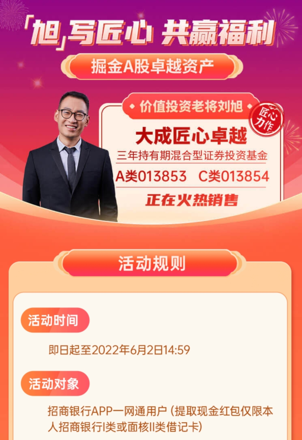 【活动内容】: 1、本次活动由大成基金主办。本次活动共设置四个任务。 任务一:点击"去关注"进入大成匠心卓越三年持有期混合型证券投资基金【代码:A类013853 C类013854】页面,点击“关注”基金产品; 任务二:点击“去观看”进入基金经理刘旭直播页面进行直播/回放视频的观看; 任务三:点击"去答题”,进入答题页面完成答题; 任务四:点击"去分享”,将活动页面分享给微信好友、微信朋友圈、QQ好友/群。 用户每完成一个任务,均可抽取一次现金红包,每个用户共有四次红包领取机会。本活动为概率中奖,不设绝对中奖。 2、本活动奖品为随机现金红包: 任务一最高金额为0.88元,红包数量共计24万个;任务二最高金额为0.88元,红包数量共计24万个;任务三最高金额为0.88元,红包数量共计24万个:任务四最高金额为0.10元,红包数量共计24万个;红包数量有限,领完即止。