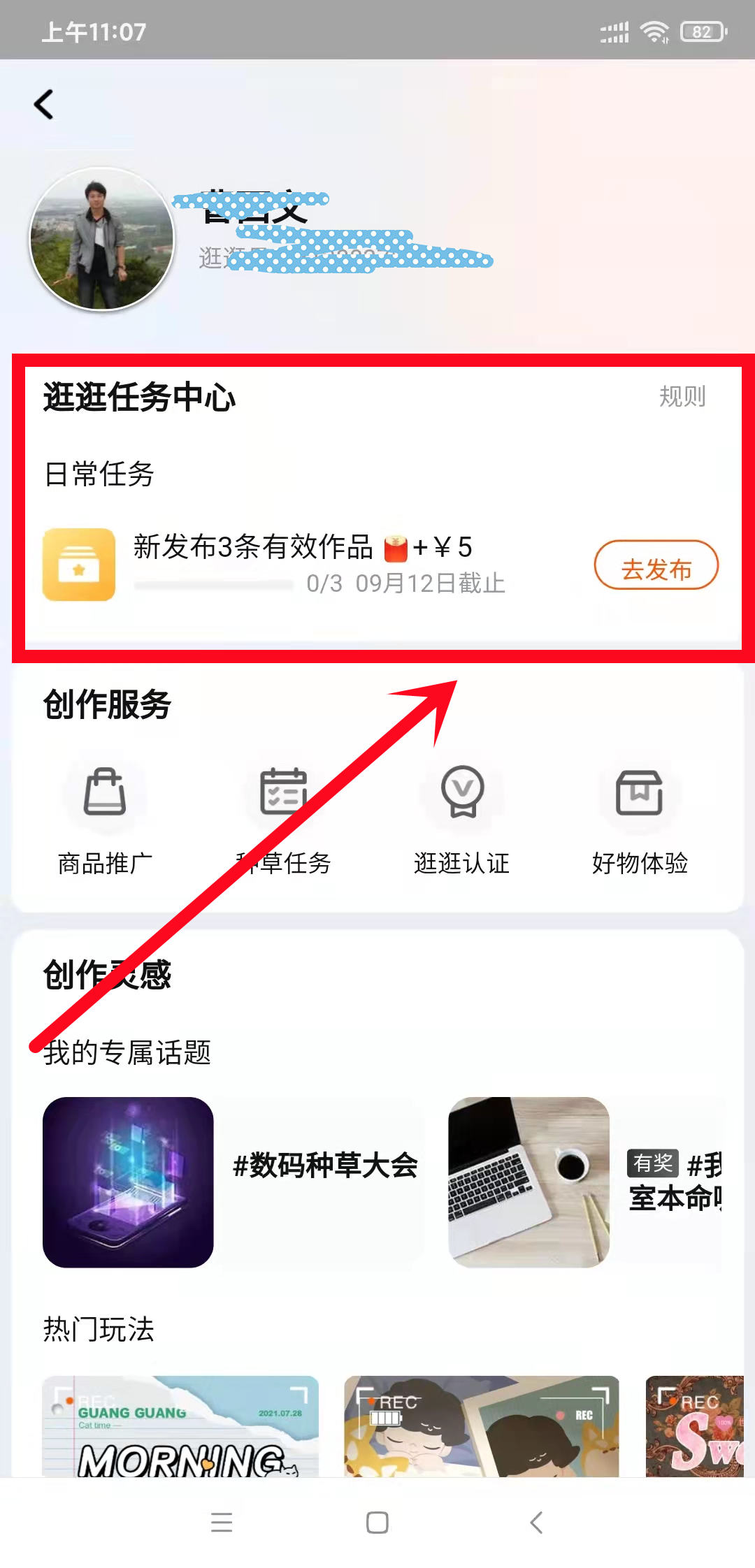 3、然后在逛逛完成指定的任务(都是拍摄视频、或者上传图片,很简单,也可以在网上找),然后再手动在创作中心领取红包(如果领红包提示服务器挤爆了,过一会再去领就可以领成功),领取到的红包可以在淘宝、天猫购买任意实物商品无门槛抵扣使用。