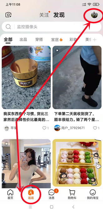 1、打开淘宝APP,点击底部的【逛逛】,再点击右上角的头像进去(需要最新版本的淘宝APP才有头像入口);