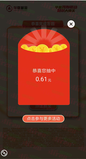 【活动内容】:参加华夏基金举办的华夏周期驱动知识大闯关抽红包活动,通过打开微信进去活动里,每个用户可以反复答题参加,只要4题全部答对就可以进行抽奖,有机会中到一个随机金额的微信红包,如果没中可以反复答题继续抽,小编测试中0.61元红包秒推,非必中。