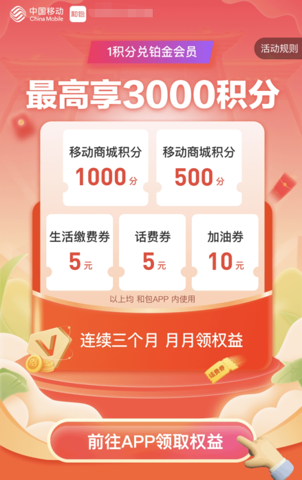中国移动1积分兑铂金会员,领1000积分/5元话费券/5元缴费等