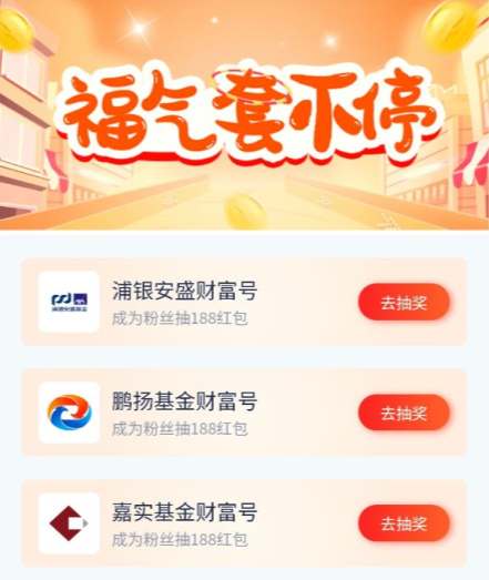 活动期间,浦发银行客户成为基金公司财富号粉丝,即可获得一次抽奖机会,随机抽取最高188元微信立减金,每位客户每家基金公司财富号仅有一次参与抽奖的机会。名额有限,先到先得。