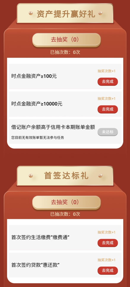 活动期间,客户登录中信银行手机银行APP进入活动页面,通过做任务获得抽奖机会,点击“去抽奖”按钮即可参与抽奖活动。