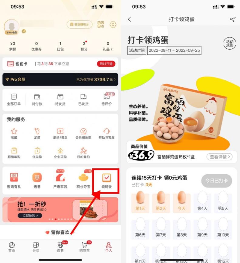 2.用户有机会随机命中连续打卡X天领整盒鸡蛋活动,鸡蛋分30颗/15颗两种规格,具体需要连续打卡的天数和鸡蛋的规格,以活动页显示为准。