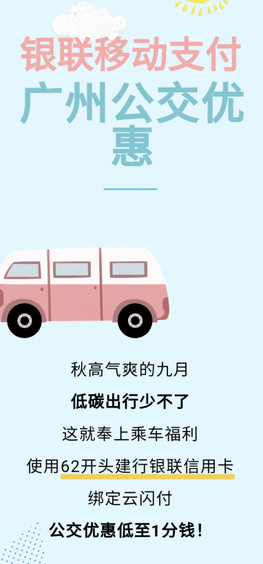 使用62开头建行银联信用卡绑定云闪付乘车码银联手机闪付,在广州市搭乘公交出行,每人每天可享受1次满0.5元随机立减0.1至2元优惠。