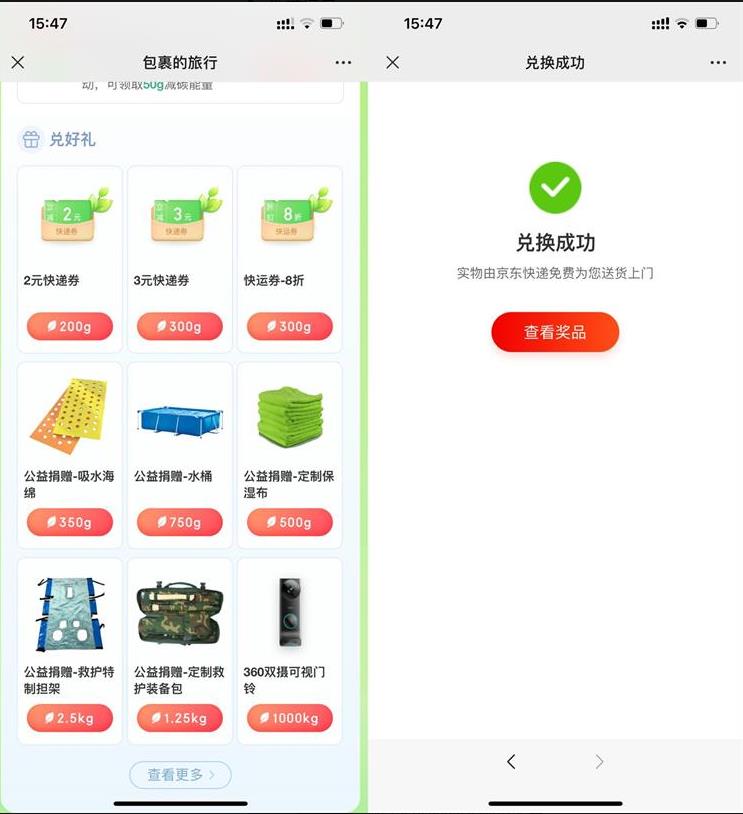 微信关注公众号“京东快递”->进入领取新人500减碳值->下拉直接兑换实物->填写地址7天内发货