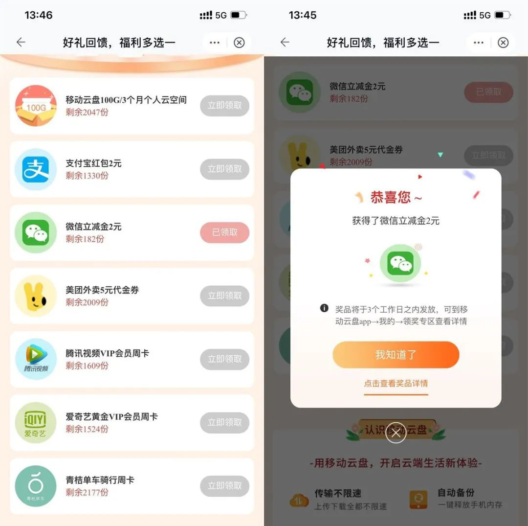 移动的两个优惠活动,免费抽话费和流量!