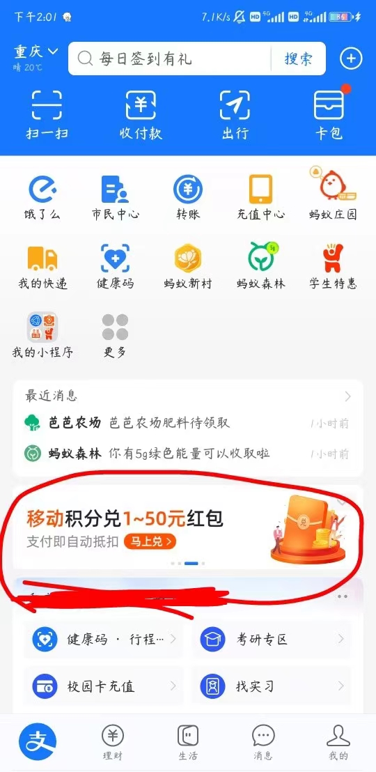 用移动或者联通积分兑换通用红包,没有这个显示的话,搜索蚂蚁链权益宝