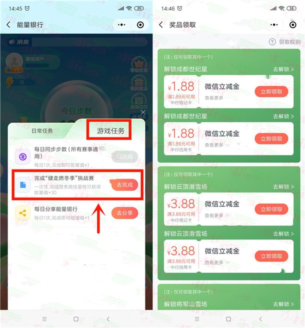 中国银行健走燃冬季挑战赛领1.88-11.64元微信立减金