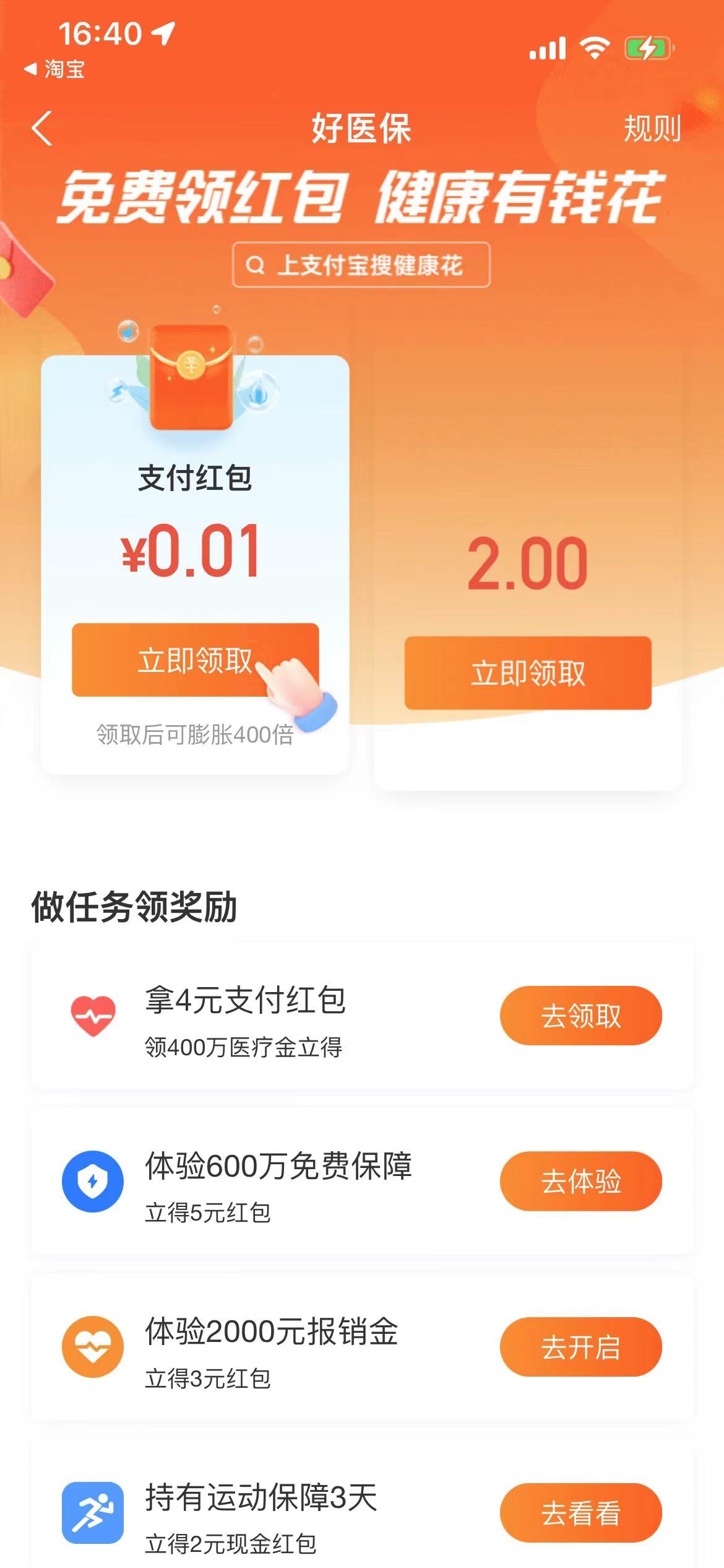 【活动内容】:支付宝健康花这个活动就是以前的好医保活动,参与方式跟之前好医保的参与方式一样,通过打开支付宝APP搜索【健康花】进去活动里,只要有显示任务就可以参加,有多个任务就可以领多个红包,进去购买指定的保险后就恶意领到指定金额的现金红包(得到的红包秒到支付宝卡包里,可以在支付宝APP付款的时候无门槛抵扣使用),购买的保险也可以退保(退保后支付的钱也会退回来)。