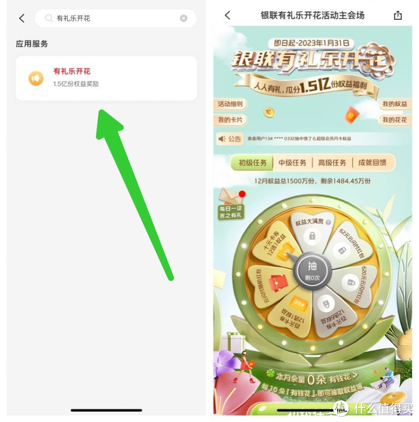 【活动内容】:参加云闪付举办的银联有礼乐开花瓜分1.5亿分权益福利,通过打开云闪付APP进去活动里,里面有初级任务、中级任务、高级任务、成就回馈任务都可以参加,完成页面指定的任务得有钱花,累积达到指定朵数就可以抽奖,每次都有机会中到0.62-6.2元红包、10-100元话费、视频会员等奖品,可以抽多次。