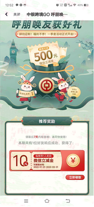 【活动内容】:这是中银跨境GO的2个活动,写在一起便于大家一起参加,通过注册下载中银跨境GO,一个活动是完成简单的分享可以领到4万个积分(2.3万积分可以兑换3个月各大平台视频会员、2.9万积分可以兑换肯德基套餐、也可以兑换百度网盘超级会员等等)。还有一个活动分享1个好友可以领取10元微信立减金(最多可以领到500元微信立减金)。
