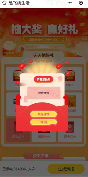 【活动内容】:参加起飞线生活举办的抽大奖赢好礼活动,通过打开微信进去小程序活动里进去,进去微信授权登录后就可以参加活动,每个微信进去可以直接抽3次,有机会中到1.08-3.88元微信红包、或者实物,如果没中可以换微信号抽,中到的红包目前秒推送,非必中。