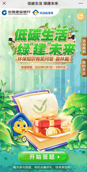 【活动内容】:参加建行劳动者港湾举办的低碳生活绿建未来答题开宝箱抽京东卡活动,通过打开微信进去活动里登录号码参加,每天有3次答题机会,分享再额外增加1次机会(无需好友助力),每答对1道题会前进一格,每到一个宝箱都可以抽奖1次,有机会中到5-50元京东卡,非必中。