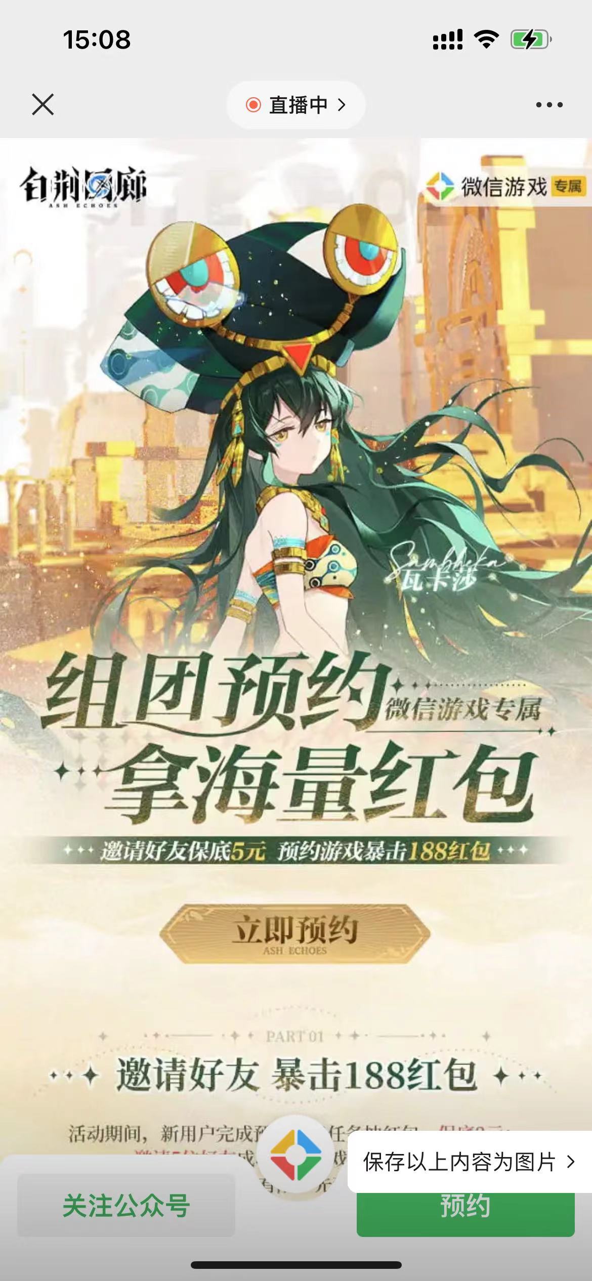 【活动内容】:参加白荆回廊举办的组团预约拿海量红包活动,通过打开微信进去活动里,在活动里预约游戏就可以领取到2-188元微信红包,分享5个好友或小号预约还可以领5元,领到的红包目前以卡券的形式到账,手游上线当天在微信里下载游戏注册就可以在微信福利中心兑换领取。