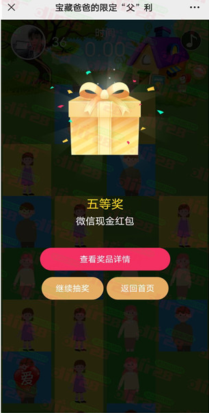 【活动内容】:参加横琴人寿在线举办的找爸爸去玩微信小游戏抽红包活动,通过打开微信进去活动里,游戏开始后页面不断显示“爸爸”和其他家人,只要用手指从下往上点击“爸爸”,千万不要点到其他家人或者跳过,只要小游戏分数达到30分就可以进行抽奖,有机会中到随机金额的微信红包、888个琴豆、实物等等,小编测试中到0.9元红包,非必中。
