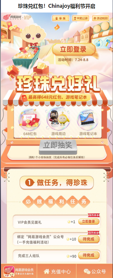 【活动内容】:参加网易游戏举办的珍珠兑好礼最高得648元红包活动,通过打开微信进去活动里,进去登录你的网易账号,然后下拉页面完成指定的任务可以获得小珍珠,消耗小珍珠可以兑换1-5元微信红包,也可以消耗珍珠抽奖,得到的红包需要去钱包里面手动提现,提现后不秒推。