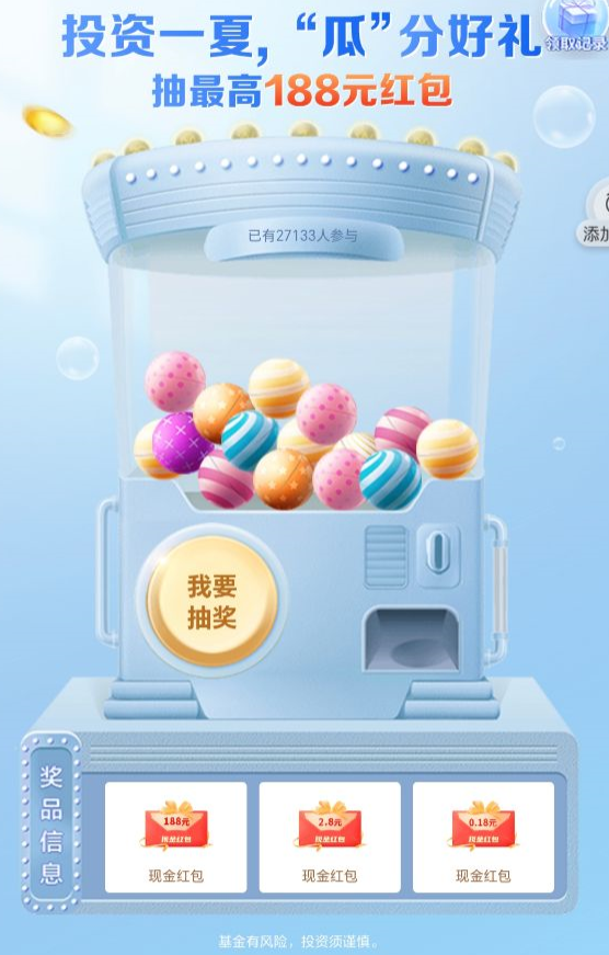 活动奖品为现金红包,红包面额为0.18-188元不等:188元,1个;2.8元,200个;0.18元,88687个,共计88888个。活动不设100%中奖,奖品数量有限,领完即止。