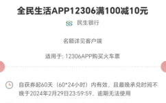 【活动内容】:活动期间,授权开通全民生活APP云闪付网络支付服务的客户,可获得10元火车票红包领取资质,红包领取到账后60日内有效,支付红包满100元可用,仅限持卡人在12306APP购买火车票并通过全民生活app选择指定民生银行62开头信用卡指定支付时使用。单用户活动期间限获取、使用1张,活动共计63,000个名额,每日限1,000个名额(每日活动名额可根据活动开展情况动态调整),以上名额先到先得,领完为止。红包领取查询路径:全民生活APP—精选页面—搜索栏搜索12306购票红包—点击活动。在活动页面点击立即领取,红包领取成功后,即可看到立即查看按钮,查看红包。