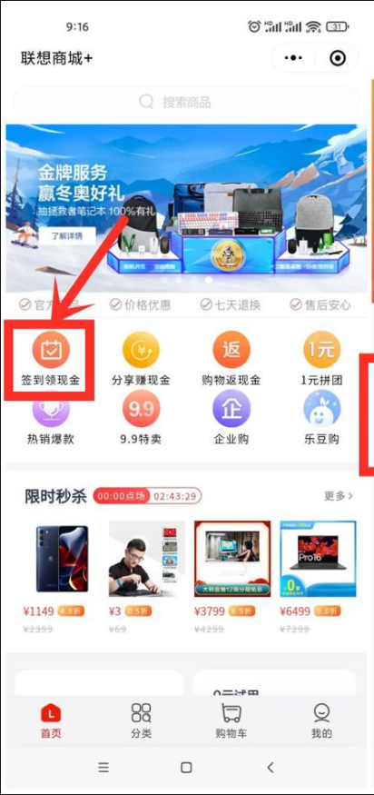 1、微信小程序搜索“联想商城+”->搜索要带+符号->首页上面->签到领现金->进来后中间。