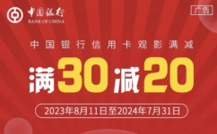 持中行银联信用卡的浙江省(不含宁波)客户,登录中国银行手机银行APP-生活为您优选-信用卡专区-热门活动-“满30-20观影活动”,需物理定位在浙江省(不含宁波)范围内可享“单张票满30减20”优惠。每个客户每月限享2张优惠,活动期间最多可享12张优惠。客户能否享受本次优惠以支付订单页展示价格为准(若活动名额已用完或已无优惠资格,支付价格为原价)客户购票仅限使用中国银行信用卡支付,不支持借记卡支付。活动时间、活动规则、活动名额可视活动情况进行调整。