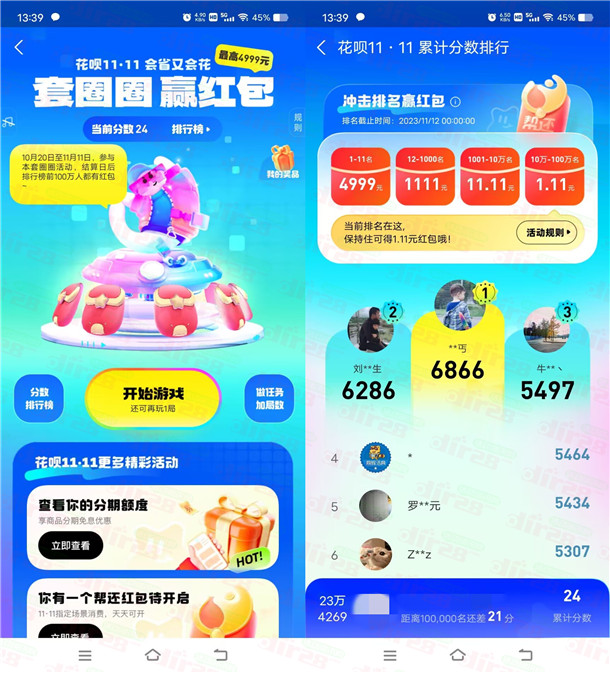小编提示:打开支付宝APP扫码进去,在11月11日前,套圈小游戏中只要累积分数排面在前100万名以内都会必得花呗红包,最低1.11元,最高4999元