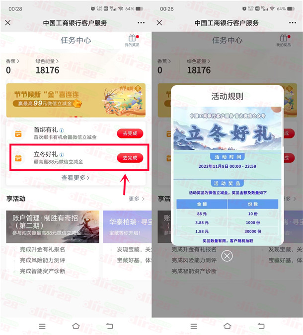 工行微信端的活动跟工行APP端的活动是两个不同平台的活动,都可以参加不冲突,这是微信端的活动,通过打开微信关注公众号【中国工商银行客户服务】进去活动里,完成简单的浏览任务就可以抽奖,有机会中到1.88-88元微信立减金,之前参加过类似活动的也可以去,小编测试中到1.88元秒到,非必中。