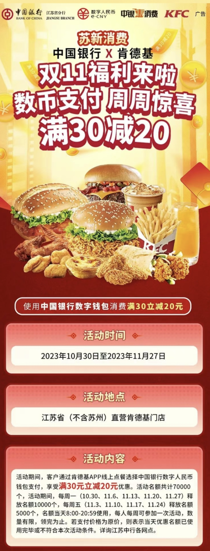 活动期间,客户通过肯德基APP线上点餐选择中国银行数字人民币钱包支付,享受满30元立减20元优惠。活动名额共计70000个,活动期间,每周一(10.30、11.6、11.13、11.20、11.27)释放名额10000个,每周五(11.3、11.10、11.17、11.24)释放名额5000个,名额当天8:00-20:59使用,每人每周可参加一次活动,数量有限,领完为止。若支付价格为原价,则表示当天优惠名额已使用完毕或不符合本次活动条件。详询江苏中行各网点。