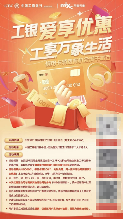活动期间,在深圳华润万象天地指定商户工行POS机使用微信绑定工行信用卡完成付款,即有机会享受单笔实付金额满1000元减100元优惠活动。活动名额共计5000个,每日名额200个,先到先得,同一用户活动期间限享2次优惠,本次活动为9月活动延续,9月-12月为同一活动期间。
