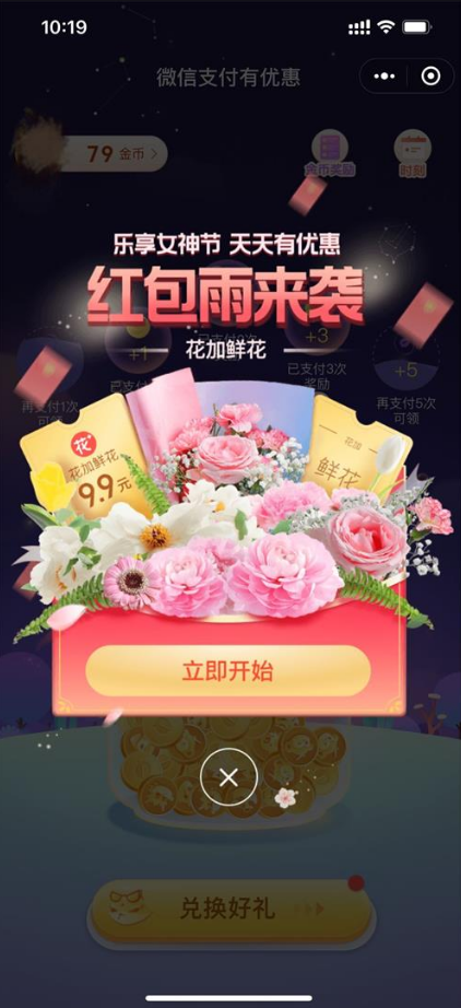 【活动内容】:微信小程序搜索“微信支付有优惠”->进来后点弹窗“红包雨来袭”->玩游戏得提现免费券->最高能获得6888提现券!
