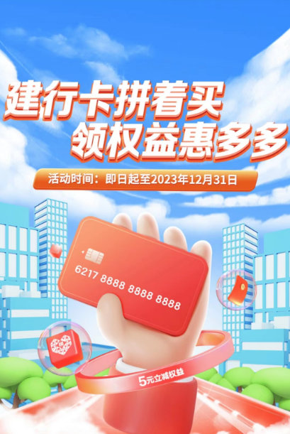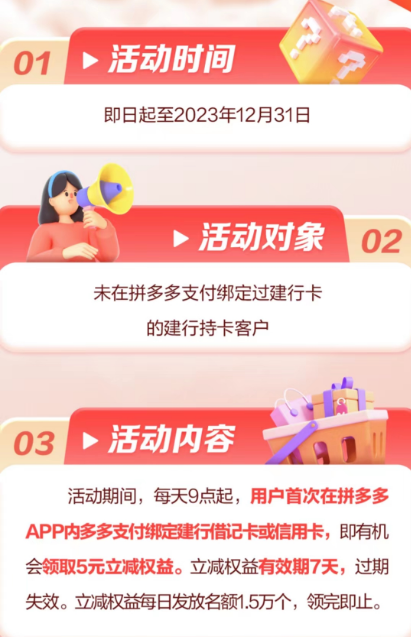 活动期间,每天9点起,用户首次在拼多多APP内多多支付绑定建行借记卡或信用卡,即有机会领取5元立减权益。立减权益有效期7天,过期失效。立减权益每日发放名额1.5万个,领完即止。