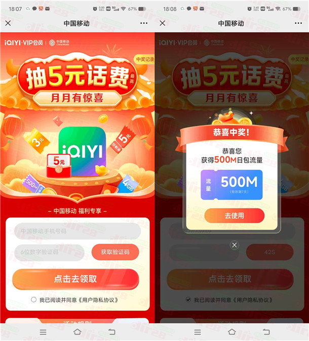 参加中国移动联合爱奇艺举办的月月有惊喜抽话费活动,通过打开微信进去活动里,进去接收手机验证码就可以抽奖1次,有机会中到1-5元手机话费、500M-4G手机流量,小编测试中到500M流量,中到的话费和流量需要打开中国移动APP手动领取才会到账。
