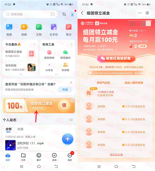参加中国移动云盘举办的组团领立减金活动,这个活动全国三网号码都可以去,通过打开中国移动云盘APP进去活动里组队参加,5个人成团后,队长可以得到1元微信立减金,队员(老用户)可领到0.3-1元支付宝红包,兑换(新用户)可领到2-8元微信立减金。