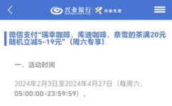 活动期间,微信实名认证个人持卡用户(公务卡、Visa/Mastercard单品牌卡除外)在特定商户使用微信绑定的兴业银行信用卡完成支付,有机会享受单笔实际支付金额满20元随机立减5元-19元优惠。活动期间,每个活动日名额约7700个,同一用户每个活动日限享1笔,每个自然月限享1次。