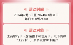 即日起至2024年3月31日每日9:00-24:00,工行卡持卡人(以下简称“持卡人”)在拼多多APP消费时使用多多支付并选择绑定的工行卡支付,储蓄卡单笔订单银行卡应付金额满500元有机会享立减15元优惠,信用卡单笔订单银行卡应付金额满500元有机会享立减18.8元优惠。
