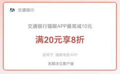 即日起至2024年3月31日,开通银联云闪付网络支付平台,交通银行指定借贷记卡客户在活动商户猫眼电影APP购买商品时,通过线上收银台-银联支付-选择交通银行APP支付,并使用指定的交通银行借贷记卡完成支付,可享订单满20元打8折优惠,单笔最高立减10元。单客户活动期间限享受2次优惠,共计约1.5万个名额,先到先得,总名额用完则活动结束。(注:猫眼电影APP中部分影院及演出等不支持退款及改签,是否支持退款及改签以猫眼电影APP展示为准,用户购买前请仔细查看。)