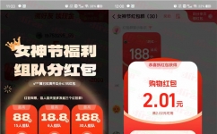 参加淘宝举办的女神节组队瓜分188元红包活动,通过打开淘宝APP进去活动里,选择指定人数组队,组队成功后可以瓜分18.8元、88元、188元红包,好友反馈每个人可以大概分到1-3元左右,可以跟好友一起组队参加,这个活动每天都可以参加1次。