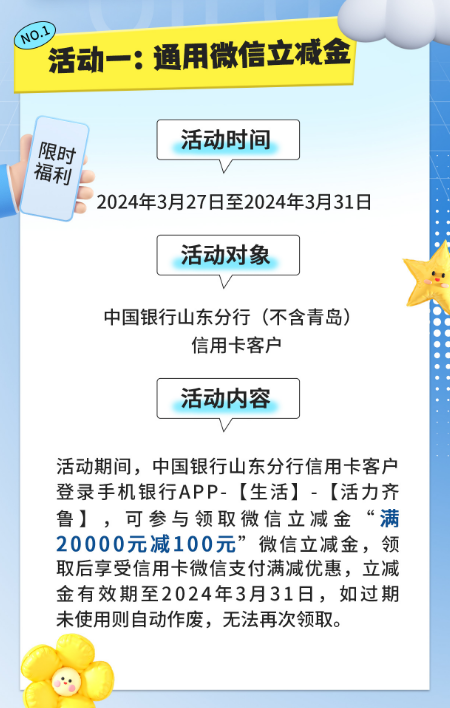 即日起至2024年3月31日,中国银行山东分行信用卡客户登录手机银行APP-【生活】-【活力齐鲁】,可参与领取微信立减金“满20000元减100元”微信立减金,领取后享受信用卡微信支付满减优惠,立减金有效期至2024年3月31日,如过期未使用则自动作废,无法再次领取。