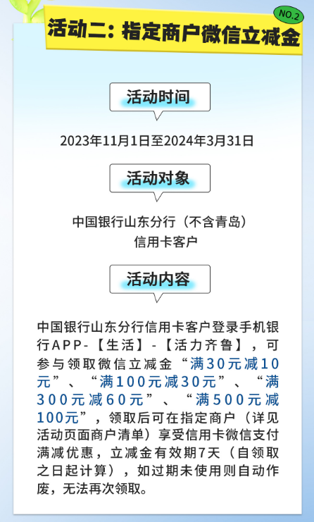 即日起至2024年3月31日,中国银行山东分行信用卡客户登录手机银行APP-【生活】-【活力齐鲁】,可参与领取微信立减金“满30元减10元”“满100元减30元”、“满300元减60元”、“满500元减100元”,领取后可在指定商户(详见活动页面商户清单)享受信用卡微信支付满减优惠,立减金有效期7天(自领取之日起计算),如过期未使用则自动作废,无法再次领取。