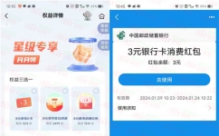 参加邮储银行举办的星级专享月月领活动,通过打开邮储银行APP进去权益专区页面,需要二星级才可以参加,如果不足二星级可以完成指定的任务达到二星级,二星级可以领到3元京东卡、或者3元支付宝红包,最高可以领到10元京东卡或者10元支付宝红包,领取后秒到账,每个月都可以领1次。
