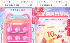 小编提示:打开中国银行APP搜索【微信立减金】进去月月领活动里,里面2个活动只能二选一参加其中1个,要么参加1元购买10元微信立减金,要么1元购买3-20元微信立减金,盲盒的活动是每天限量,秒杀的活动是每个整点限量
