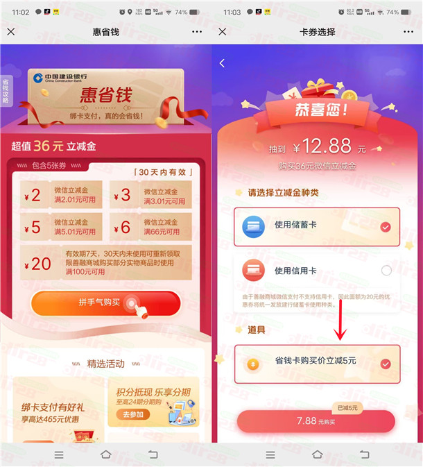 参加中国建设银行举办的购买惠省钱卡送微信立减金活动,这个活动很简单,通过打开微信进去活动里,先登录抽取购买价格(一般都是抽中2.2折优惠价,也就是7.99元),然后支付7.99元购买这个惠省钱卡,购买后会到账16元微信立减金+20元善融商城立减券,16元微信立减金分为(1张2元+1张3元+1张5元+1张6元到账)。