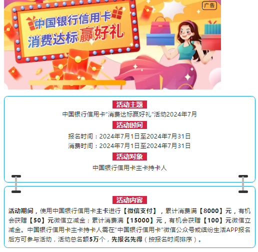 活动期间,使用中国银行信用卡主卡进行【微信支付】,累计消费满【8000】元,有机会获赠【50】元微信立减金;累计消费满【15000】元,有机会获赠【100】元微信立减金。中国银行信用卡主卡持卡人需在“中国银行信用卡”微信公众号或缤纷生活APP报名后方可参与活动,活动总名额5万个,先报名先得(按报名时间排序)。