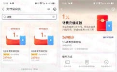 这是支付宝会员中心积分兑换话费红包的活动,有中国电信手机号码的可以去(移动和联通手机号码自测),通过打开支付宝APP进去会员中心用269个积分兑换1元话费红包,兑换后再去“中国电信”APP,在APP里可以自定义金额充值1元话费,支付方式选择支付宝就可以用1元红包抵扣,实测0元充1元电信话费。