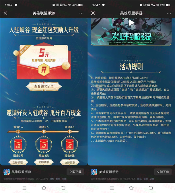 【活动内容】: 参加英雄联盟举办的微信新一期注册领红包活动,通过打开微信进去活动里,首次在微信里下载游戏并且用微信首次注册登录游戏,就可以回到活动里领取到5元微信红包,注册红包限量40万个,需要首次注册的新用户才可以,数量限量。 小编提示:首次在微信下载游戏注册领5元红包,限量40万份,数量限量 【活动 ...