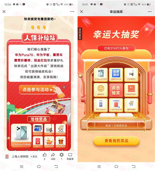 【活动内容】: 参加上海人保财险举办的五一出游季活动,通过打开微信进去活动里,没有关注公众号的需要先关注公众号,每个人有6次游戏机会(进去2次、完成4个浏览任务再增加4次),小游戏分数达到120分可以抽奖,有机会中到2.88元微信红包、5元充电红包、实物,中到的2.88元红包需要在“我的奖品”里手动提现,如果中到的 ...